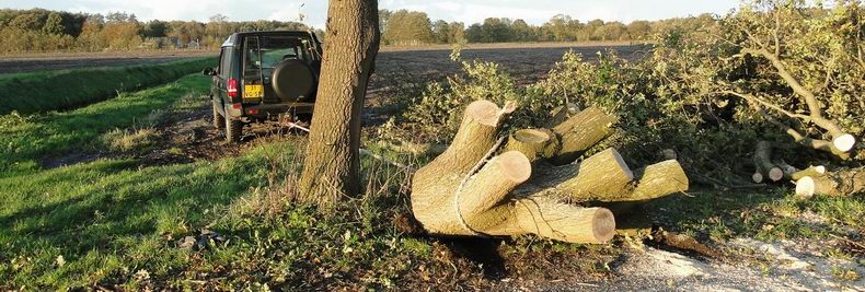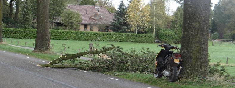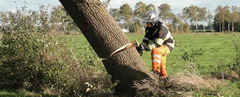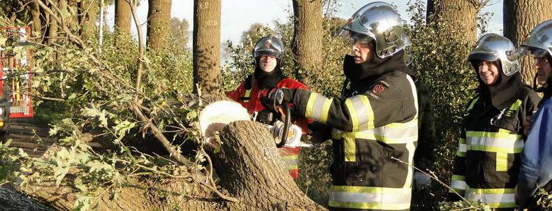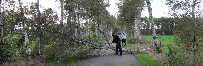 | Nog steeds komen er waarschuwingen binnen bij de alarmcentrales over de gevolgen van de storm, die twee dagen geleden woedde. Woensdagmiddag werd de blusgroep van de Krim verzocht naar de Barsweg in Hollandscheveld te rijden, omdat daar een grote eik op de weg dreigde te vallen. De boom bleek inderdaad al flink over te hellen en men besloot er de knetterbijlen in te zetten, nadat de weg ter plaatse afgezet was. De eik viel weliswaar een stukje, nadat de zaagsnede ver genoeg gevorderd was, maar had nog wat wiggen nodig om tegen de vlakte te gaan. Daarna werd het gevaarte met twee kettingzagen ontdaan van z'n takken, maar zelfs de in tweeën gezaagde stam bleek veel te zwaar om met de hand de berm in te verplaatsen. De terreinwagen van één van de leden van de blusgroep sleurde de zware houtblokken echter bijna moeiteloos aan de kant. |