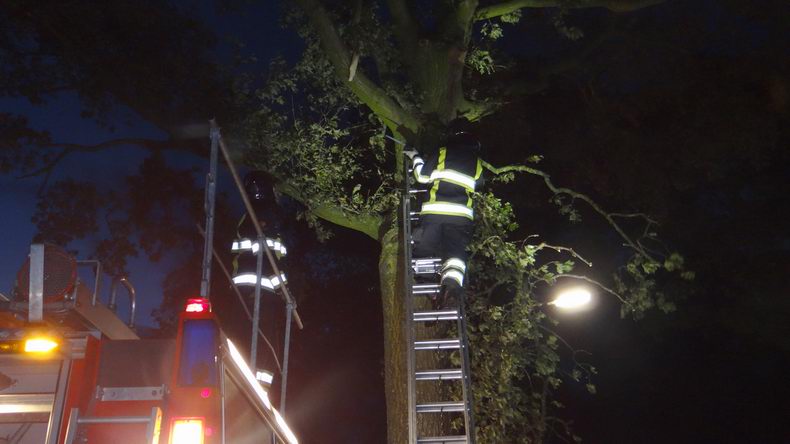 | Met het risico, dat het een afgezaagd verhaal wordt... maar net na zonsondergang kreeg de blusgroep van Slagharen weer een verzoek, stormschade aan te pakken. Het bleek om een niet al te frisse eik te gaan, die aan de Herenstraat stond, tegenover de ingang van de firma Schlepers. In eerste instantie leek het om één half-afgescheurde tak te gaan, maar naarmate men de eik nader onder de loep nam, kwamen er steeds meer losse takken aan het -schaarse- licht. Tak nummer 1 kon nog met een touw weggetrokken worden, maar voor z'n collega's moesten er meer trucs uit de hoge hoed getoverd worden, waarbij een lange ladder en een accu-reciprozaag goed van pas kwamen. Daarbij moest het verkeer op de drukke verbindingsweg veilig langs de werkplek geleid worden om narigheid te voorkomen. Al met al groeide het klusje uit naar een een klus van dik een uur... |