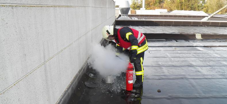 Donderdag tegen 10:15 uur ontdekten medewerkers van een machinefabriek aan de Manfred Voshaar Straße, dat er een sterke brandlucht in het gebouw hing. Al snel bleek, dat er een begin van brand was in een luchtafvoerpijp, die op het dak van de hal uitmondde. |