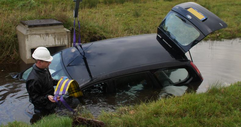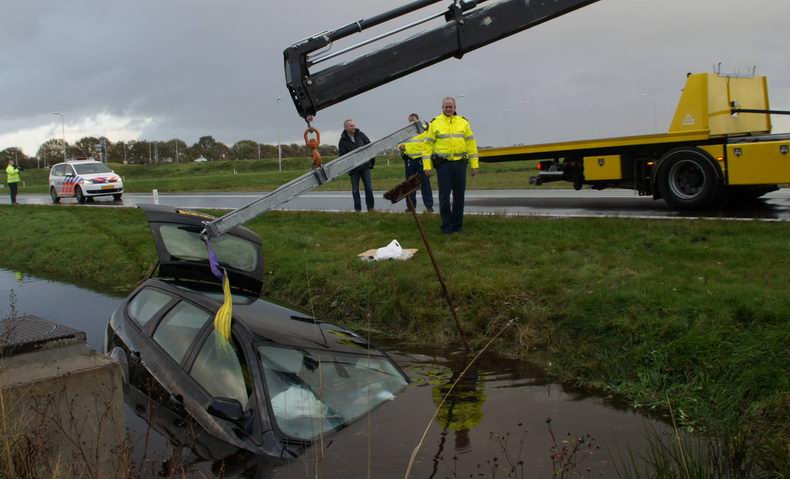 | Zondagmorgen om 08:21 uur werd alarm geslagen, omdat voorbijgangers een spoor in de berm van de Burgemeester H Boersingel ontdekten, dat naar een naast de weg gelegen vijver leidde. Daar bleek een kleine auto grotendeels onder water te liggen. Toen een voorbijganger poolshoogte nam, het water in ging en door de ramen probeerde te kijken, werd niet duidelijk, of zich nog mensen in het voertuig bevonden. Alarmnummer 112 werd gebeld, waarop de centralist de hulpverleners naar de even verderop liggende Boomcateweg zond. Brandweerlieden bedachten zich geen seconde, gingen het water in en probeerden er achter te komen of er nog slachtoffers in het voertuig zaten. Maar pas toen de auto naar de wal was gelierd, werd duidelijk, dat het voertuig leeg was. Politiemensen trokken het kenteken na en namen kontakt op met de kentekenhouder, waaruit bleek, dat de inzittenden veilig uit het voertuig waren ontsnapt, maar verzuimd hadden, de politie te bellen... Het ongeval zou enkele uren eerder -naar verluidt rond 06:00 uur- gebeurd zijn. Berger Wolves haalde de total loss Citroën op. |