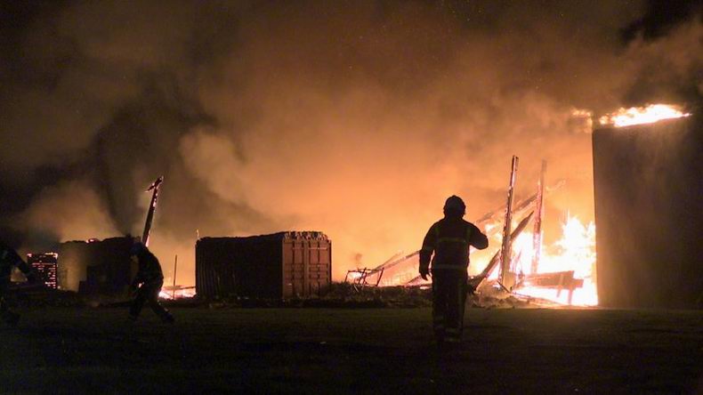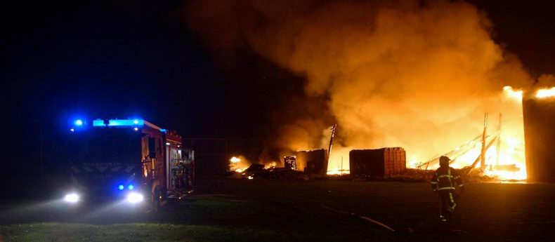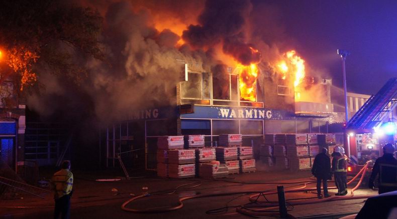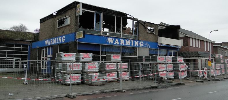 | Het al jaren leegstaande bedrijfspand, waar ooit Warming Dieselservice in gevestigd was en waar in de afgelopen jaren al diverse keren brand in is gesticht, is zaterdagavond eindelijk definitief afgebrand. Rond half elf werd aan de brandweer van Coevorden en van Emmen gemeld, dat er brand op de eerste verdieping van het pand woedde en vier minuten later werd al opgeschaald naar "middelbrand" en kwam een watertankwagen uit Zwinderen te hulp om zich van de bluswateraanvoer te verzekeren (Er wordt namelijk in Drenthe geen gebruik meer gemaakt van de "oude" brandkranen). Kort daarop werd ook assistentie gevraagd van de brandweer Schoonebeek, toen duidelijk was, dat het om een grote uitslaande brand ging en er gevaar voor uitbreiding was. De blusgroep van Slagharen is niet opgeroepen, hoewel dat elders op het web wel beweerd wordt. De brand leek na enige tijd eindelijk onder controle, maar toen de bluswateraanvoer stil viel omdat de tanks leeg waren, kreeg de Rode Haan vrij spel en laaiden de vlammen weer hoog op. Het dak vloog nu volledig in brand vloog, stortte in en tonnen bluswater stroomden dwars door de vlammen naar beneden. Uiteindelijk was de brandweer pas na middernacht de brand meester. Het pand, dat op de nominatie stond om gesloopt te worden, ging volledig verloren. Het eveneens al jaren leegstaande pand ernaast, waar ooit een discotheek in gevestigd was, bleef behouden. * De stapels stenen voor het pand stonden klaar voor de vernieuwing van de bestrating in de omgeving; niet voor een vermeende renovatie van het gebouw |