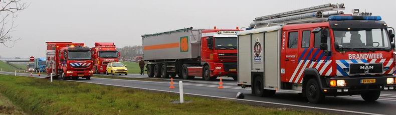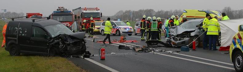 is nog onduidelijk. Wel ontstond er op de N34 bij de oprit van de Rondweg Coevorden zaterdagavond tegen half acht een aanrijding, waar in totaal negen voertuigen bij betrokken raakten: acht personenauto's en een trekker met oplegger. De bestuurder van het laatstgenoemd voertuig wist zijn combinatie bijtijds stil te zetten, anders had de uitkomst van de massale carambolage heel wat ernstiger uitgevallen. Nu is een licht gewonde met pijn in de borst per ambulance voor onderzoek naar een ziekenhuis vervoerd en kon het letsel van anderen ter plaatse worden behandeld. Wel klapte er nog een personenauto tegen de achterzijde van de oplegger en werd die auto ook weer van achteren geraakt, waardoor de som opliep tot acht onherstelbaar beschadigde personenauto's. Wie de ravage ter plaatse gezien heeft, zal beamen, dat de betrokkenen hier heel veel geluk hebben gehad. Nadat de VOA haar werk had afgerond, mocht berger Koolen de personenauto's ophalen. |