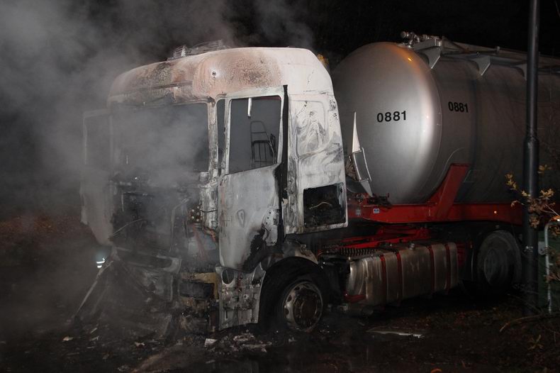 | Woensdagavond rond half twaalf werd er groot alarm geslagen: brand in een trekker met tankoplegger op de parkeerplaats van wegrestaurant Les Routiers, tussen de afslagen Nunspeet en Harderwijk. De oplegger bleek geladen met onschadelijke lading korrels. De trekker is volledig verwoest. |