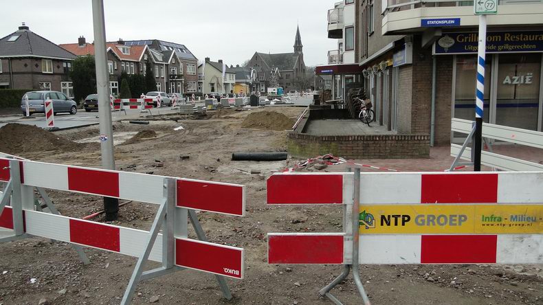 | De stapels straatstenen en trottoirbanden stonden klaar voor de vernieuwing van de bestrating in de omgeving van het Stationsplein en de van Heutszsingel; niet voor een vermeende renovatie van het gebouw. |