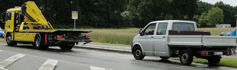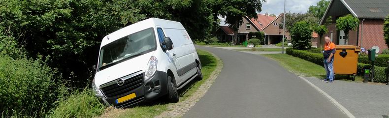 | Een bijna-aanrijding in Den Velde liep woensdagmorgen nog goed af. Een pakketpostbesteller, die in opdracht van Post.nl reed, werd op de Rondweg in een door struikgewas en takken onoverzichtelijke bocht verrast door een hem tegemoet rijdende extra-brede tractor, die richting Gramsbergen reed. Gelukkig reden beide bestuurders met aangepaste snelheid en kon de bestelbuschauffeur een aanrijding vermijden door naar rechts uit te wijken, maar de bus zakte daardoor met de rechter wielen in een bermgreppel. De bus liep door deze manoeuvre echter geen schade op. Berger Klaas van de firma Autax takelde de bus vakkundig het wegdek op, waarna de besteller zijn weg kon vervolgen. |