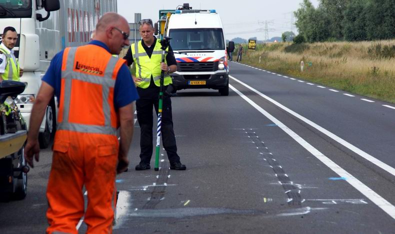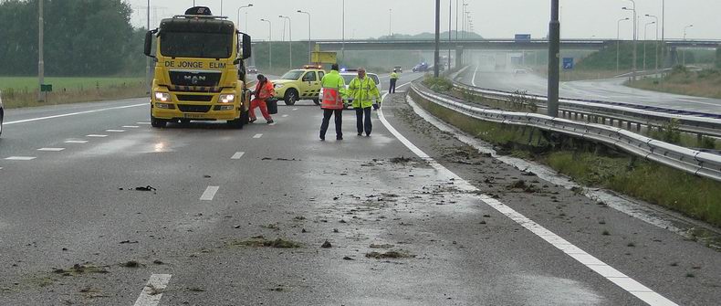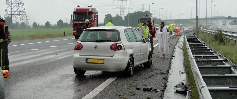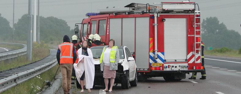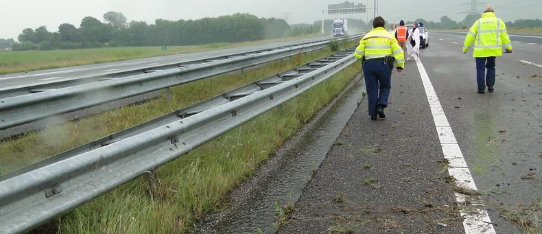 | De drie inzittenden van een Volkswagen Golf mochten van geluk spreken, dat ze de slippartij zonder noemenswaardig letsel kunnen navertellen. De auto raakte tijdens zware regenval even voorbij knooppunt Holsloot door aquaplaning onbestuurbaar, botste frontaal tegen de middenvangrail en verloor daardoor nogal wat onderdelen. De Golf kwam een meter of 30 verderop achterstevoren op de "snelle" rijstrook tot stilstand. Voor alle zekerheid werd ook de brandweer van Sleen opgeroepen, maar voor de spuitgasten bleek er niets bijzonders te doen. Het verkeer richting Duitsland ondervond nauwelijks oponthoud. Berger De Jonge ruimde de rommel op en sleepte het autowrak weg. |