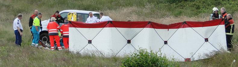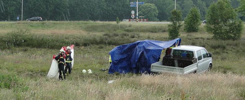 | Twee mannen waren getuige van het ongeval, toen ze in de omgeving spandoeken voor het PK-Weekend van 11-13 Juli ophingen. Eén van hen verdraaide tijdens de sprint naar de brommobiel zijn knie en moest in het ziekenhuis gecontroleerd worden. Hij is voorlopig aan bed gekluisterd met een flink gezwollen knie. |