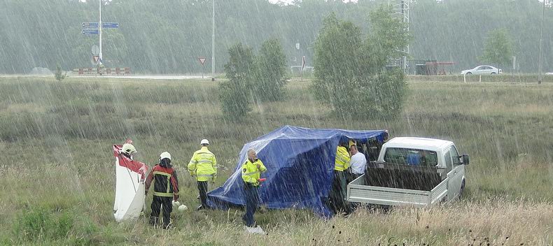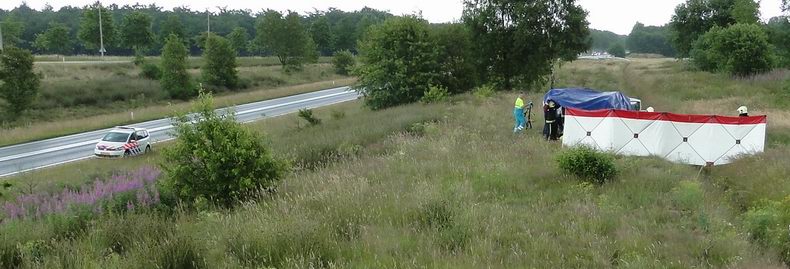 | Zaterdagmiddag namen voorbijgangers, die een Duitse dubbelcabine VW Transporter pickup op het talud bij de rotonde zagen staan, poolshoogte en ontdekten daar het roerloze lichaam van een man. Ondanks langdurige reanimatiepogingen en de inzet van het MMT lukte het niet, het slachtoffer (55, uit Nieuw Amsterdam) tot leven te wekken. De hulpverleners werden tijdens een wolkbreuk door een geïmproviseerde tent tegen het overvloedige hemelwater beschermd. Uit sporen was af te lezen, dat de auto via de Middelesweg (N376) uit de richting van Noord-Sleen was gekomen, op de rotonde uit de koers was geraakt en vervolgens van het talud in de richting van de autoweg was gereden. |