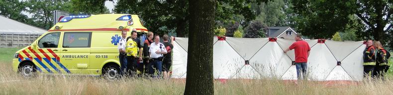| Het incident rond de VW Transporter bij Noord-Sleen was amper afgesloten, of de volgende oproep kwam al binnen: een verkeersongeval -naar verluidt- op de Achterloo tusen Dalen en Coevorden. Het bleek echter te gaan om een eenzijdige aanrijding op de De Loo: een Casalini brommobiel, die uit de richting van de Hulsvoorderdijk kwam, was op de De Loo over de middengeleider gereden en rechts van de weg frontaal tegen een boom gebotst. Ook in dit geval was de bestuurder (83, uit Dalen) tijdens de rit onwel geworden. Getuigen zagen, dat de bestuurder ineengezakt achter het stuur zat, voordat de auto de boom raakte. Snelle medische hulp (waaronder hartmassage door brandweerlieden) mocht niet baten. |