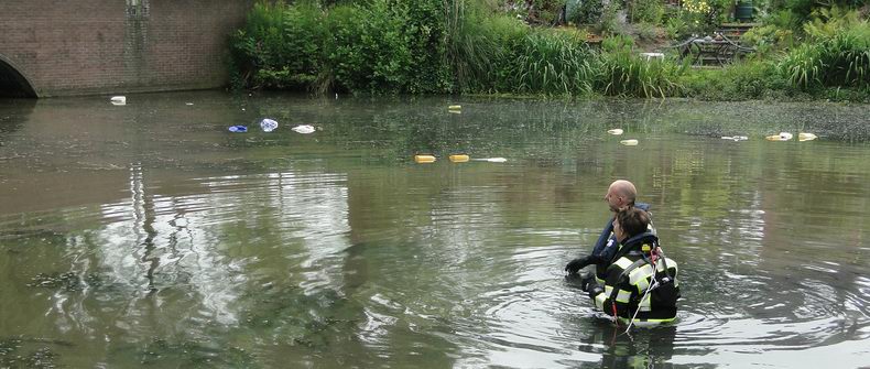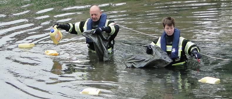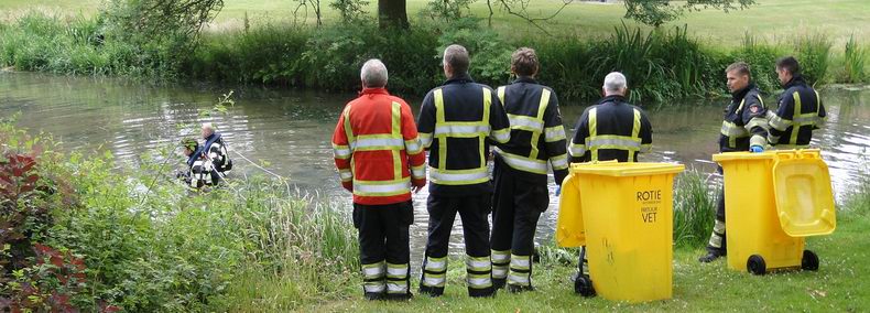 | Zaterdagmorgen reed een ploeg van de Hardenberger brandweer naar de vijver aan de Dr Albert Schweitzerlaan voor een opmerkelijke klus: het uit het water vissen van een dozijn plastic containers met gebruikt frituurvet. De flessen waren afkomstig uit de gele inzamelcontainers, die nabij de vijver staan en in de afgelopen nacht het water in zijn geduwd. Het opruimen verliep voorspoedig en het reddingvest, dat zichzelf automatisch opblaast bij kontakt met water, bleek uitstekend te functioneren. |