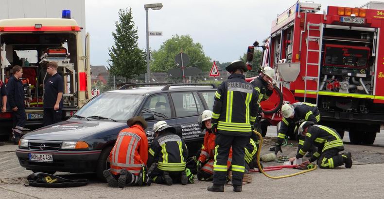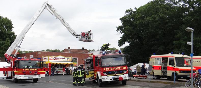 | Volgens de meteorologen hadden de brandweer Georgsdorf en de Malteser Hilfsdienst Nordhorn als organisatoren van hun open dagen zondag weinig goeds te verwachten en de voorspellingen kwamen helaas ook uit: zware buien trokken over de gehele Grafschaft Bentheim. Toch lieten ze zich niet uit het veld slaan en tussen de buien door kon het publiek genieten van demonstraties, terwijl men tijdens de buien prima onderdak vond in de brandweergarage, waar de "Kaffee und Kuchen" uiteraard klaar stonden. De Nordhorner Malteser vierden hun veertigjarig bestaan en de mensen van de brandweerpost Georgsdorf verheugden zich over de ingebruikname van hun nieuwe kazerne. In Nordhorn stond de brandweer de Maltesers bij bij een demonstratie slachtofferredding en in Georgsdorf kon men -zodra het weer het even toeliet- in een gondel omhoog mocht met een kraan van de firma J+B Küpers voor een fraai uitzicht over de omgeving. Uiteraard waren de nieuwe kazerne en het materieel te bezichtigen en was er voor de speelgrage kids van alles te doen. Ondanks het slechte weer kunnen de organisatoren terugkijken op een geslaagde feestdag. |