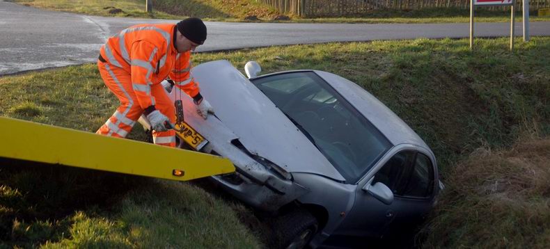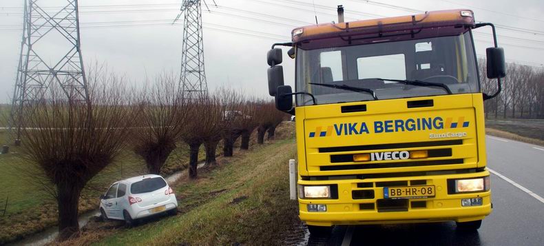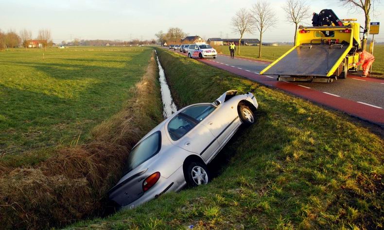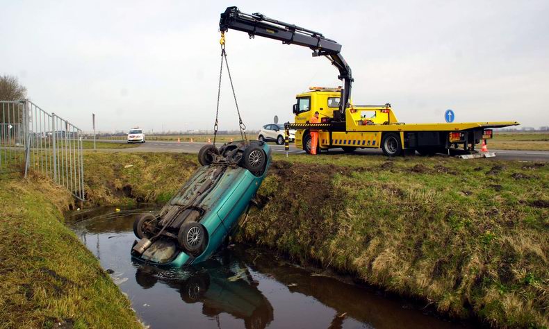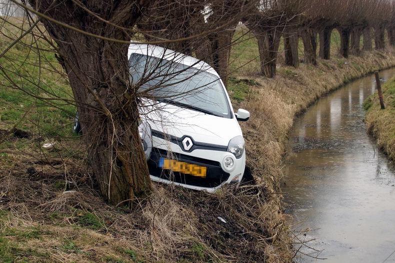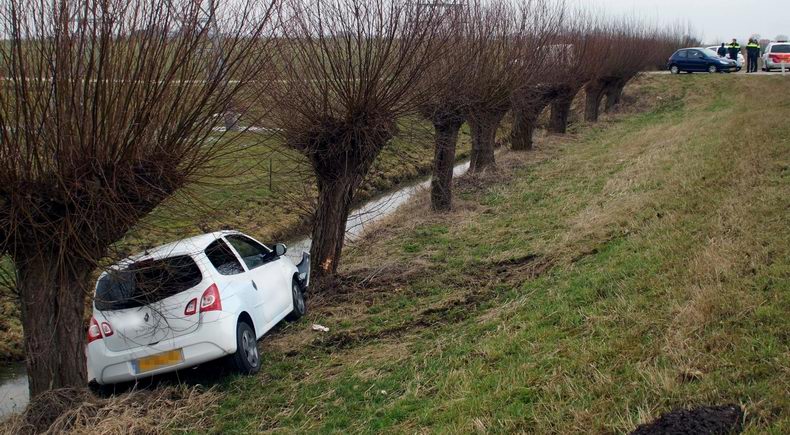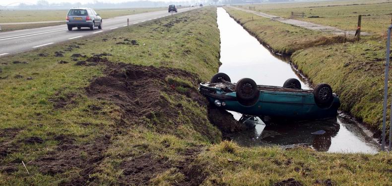| Op de Nieuwe Weg (de N759) is zaterdagmorgen een auto van de weg geraakt en ondersteboven in een sloot terecht gekomen. De automobilist kwam ter hoogte van de rioolwaterzuiveringsinstallatie met de wielen in de berm en probeerde middels een ruk aan het stuur weer op de weg te komen. Helaas gebeurde het tegenovergestelde: de auto werd onbestuurbaar, ploegde door de berm en kwam vervolgens op het dak in de sloot tot stilstand. De drie inzittenden konden op eigen kracht het voertuig verlaten. Een passant heeft het doorweekte drietal opgevangen in zijn auto om weer op temperatuur te komen. Eén van de inzittenden is door ambulancepersoneel onderzocht op letsel. Hiervan bleek gelukkig geen sprake, waarna de drie thuis werden gebracht. De totaal vernielde auto is door bergingsbedrijf Hooikammer uit de sloot getakeld en afgevoerd. Tijdens de berging werd het verkeer beurtelings langs het bergingsvoertuig geleid. |