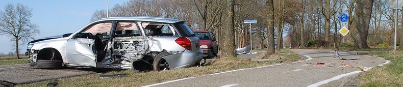 | Op de Meester Werkmanstraat in Hellendoorn zijn vanmiddag twee auto's op elkaar gebotst ter hoogte van de Oude Twentseweg De bestuurder van de Subaru Legacy probeerde nog uit te wijken, maar hij botste daardoor tegen twee bomen. De brandweer heeft het ambulancepersoneel geassisteerd bij het uit het voertuig halen van de bestuurder van de Subaru. De bestuurder van de andere auto -een VW Golf- raakte niet gewond. De Subaru was total loss; de twintig jaar oude rode Golf relatief licht beschadigd. De weg is tijdelijk afgesloten geweest. |