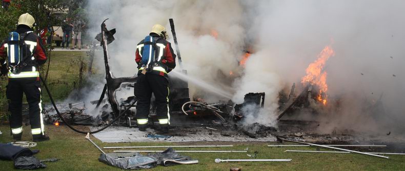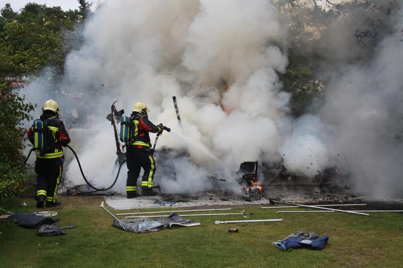 Op camping De Norgerberg in Norg is zondagmiddag een caravan volledig uitgebrand.