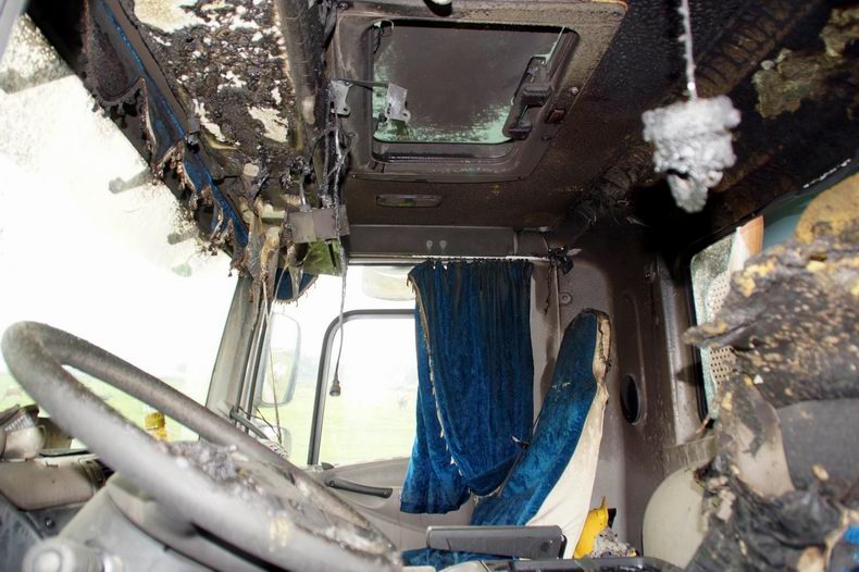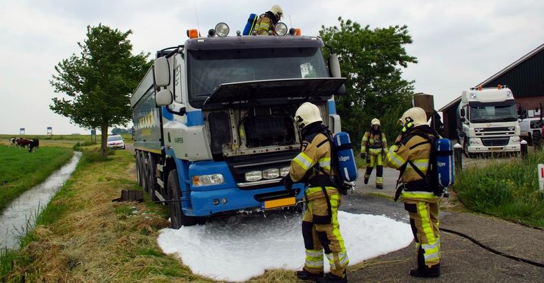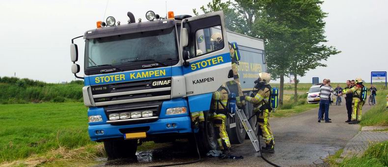 | De chauffeur van een met zand geladen vrachtwagen merkte, toen hij op de Kamperzeedijk reed, dat zijn truck een naar luchtje begon te krijgen. Om eens te kijken wat er precies aan de hand was, besloot de chauffeur de afslag naar de Korenbeltweg te nemen. De man deed een kleine inspectie en al snel zag hij dat er rook vrij kwam bij de motor. Een boer, die alles gade sloeg, aarzelde geen moment en alarmeerde de brandweer. Vlak voordat de brandweer ter plaatse was, kwamen er -naast een flinke hoeveelheid rook- ook ineens vlammen vanuit het motorcompartiment. Het vuur ging razendsnel vanuit de motor langs de cabine omhoog. Door de hitte sprong een ruit, waardoor het vuur ook in de cabine vrij spel had. De brandweer van Genemuiden had de brand echter snel onder controle. Getracht werd om de cabine te kantelen maar door de brand was dit niet meer mogelijk. Om er toch zeker van te zijn dat het vuur gedoofd was, werd een laag schuim aangebracht. Wat de brand heeft kunnen veroorzaken is niet bekend. De truck was vandaag, na een flinke revisiebeurt, voor het eerst weer op de weg. Of dit iets met het ontstaan van de brand te maken heeft, is niet bekend. |