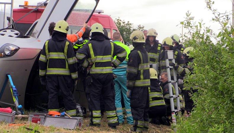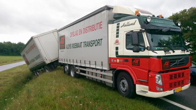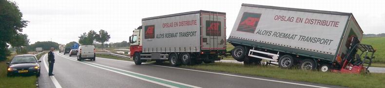 | Op de N48 richting Zuidwolde -net onder het klaverblad van Hoogeveen- kroop vrijdagmiddag een medewerker van een mediabedrijf door het oog van de naald. Hij zag, dat de aanhanger van een hem tegemoet rijdende vrachtwagencombinatie slingerde, waarna de motorwagen direct op zijn weghelft kwam en de aanhanger de bermsloot in kantelde. De automobilist hield het hoofd koel, remde en stopte veilig in de berm om de vrachtwagenchauffeur te helpen. Die was gelukkig niet gewond, maar wel flink geschrokken. Wonder boven wonder waren er, ondanks het zeer drukke verkeer, geen andere weggebruikers bij het incident betrokken. De politie arriveerde even later en ook een auto van Rijkswaterstaat om de "plaats incident" te beveiligen. Omdat het om een ongeval op een “Incident Management”-traject ging, werd berger Kraal opgeroepen. De schade aan de aanhanger en de circa 20 ton lading leek mee te vallen. De “Kooi-Aap”, die achter op de aanhanger zat en de balans verstoorde, was mogelijk de oorzaak van het slingeren. |