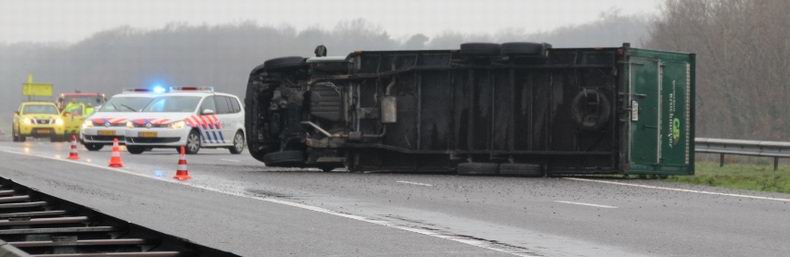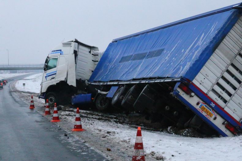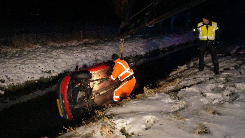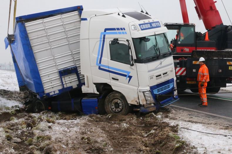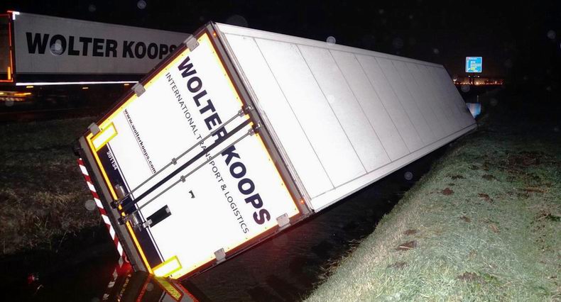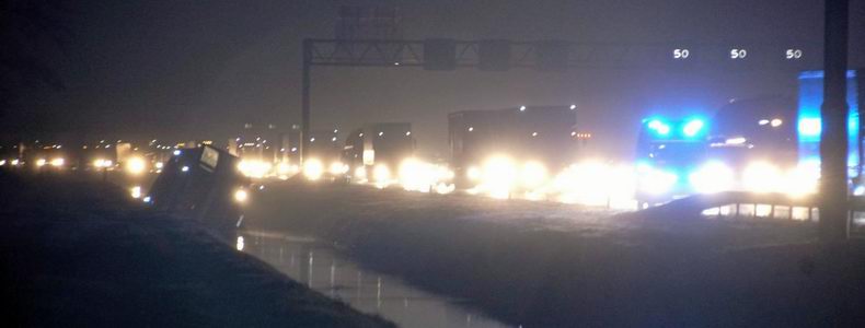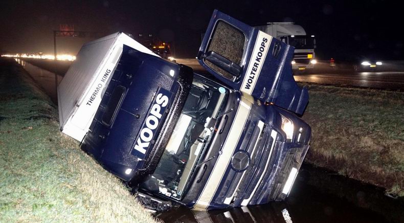 Bij Zwolle was al een vrachtwagen geschaard, maar ook bij Staphorst gleed een trekker met koeloplegger door de ijzel van de weg en in dit geval een sloot in. De chauffeur kon zonder hulp uit de cabine klimmen en werd ondergebracht bij bergingsbedrijf Hooikammer. In overleg met Rijkswaterstaat werd besloten de berging van het voertuig uit te stellen tot een later tijdstip. Het was te druk en te gevaarlijk om direct tot berging over te gaan. Het verkeer tussen Zwolle en Steenwijk moest stapvoets rijden op de spiegelgladde snelwegen. Enkele passerende hulpdiensten, die de vrachtwagencombinatie in de sloot zagen liggen, stopten toch even om poolshoogte te nemen. Toen duidelijk werd dat alles in orde was vervolgden zij hun rit. Het ongeval en de ijsvorming op de snelwegen leidden tot een file van enkele kilometers. De berging van de vrachtwagen zal vanavond na 21:00 uur plaatsvinden. |