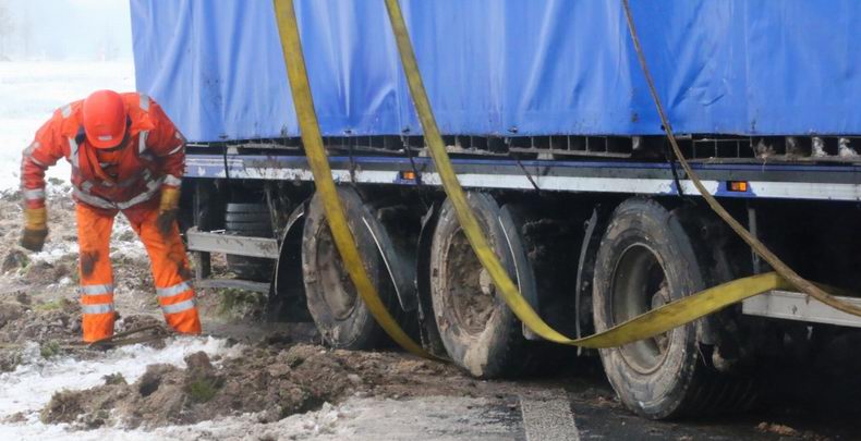 | A28: trekker met oplegger verspert spiegelgladde A28 |