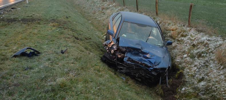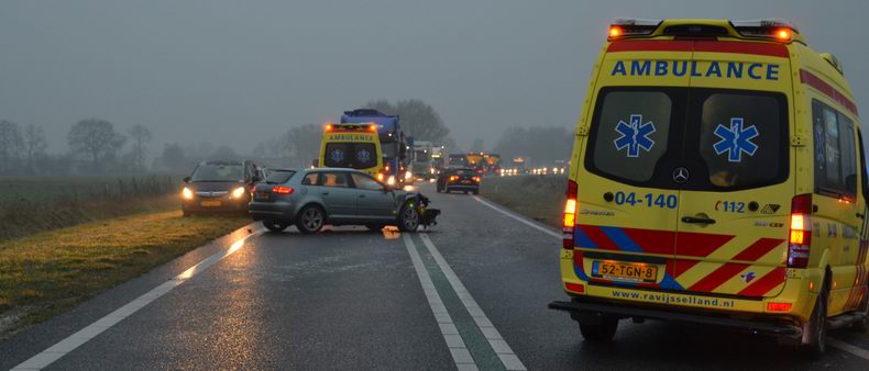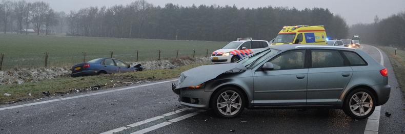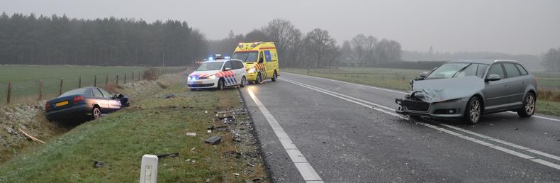 | Woensdagmorgen in de spits zijn twee auto's frontaal op elkaar gebotst op de spiegelgladde N36 bij Diffelen. Het verkeer tussen Mariënberg en Hardenberg kwam volledig tot stilstand en kon pas rond kwart over tien weer worden vrijgegeven. Eén auto -een blauwe Volvo S40- is door de aanrijding in de (droge) bermsloot terecht gekomen; de andere -eengrijze Audi A3- stond dwars over de weg. De slachtoffers zijn per ambulance naar een ziekenhuis vervoerd. In de alarmering werd gewag gemaakt van een "auto te water" en er werd dan ook een waterongevallengroep uit Zwolle opgeroepen, maar dat bleek niet nodig. |