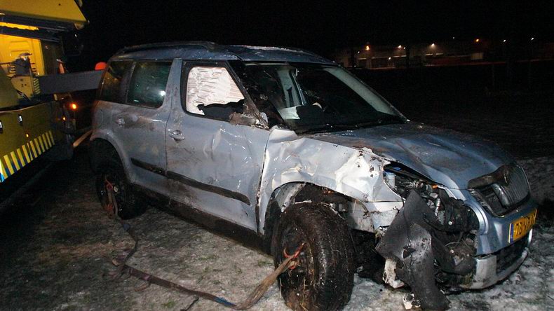 | Een Peugeot 307 Stationwagen is maandagavond op het door ijzel spekgladde wegdek van het Alteveerviaduct geslipt en plette daarbij een lantaarnpaal. De lichtmast brak af, maar werd door de bosschages op het talud opgevangen, waardoor de lantaarnpaal op zijn beurt de auto tegenhield, zodat die niet van het steile talud af rolde. Dit tot opluchting van de twee inzittenden. Eén van hen moest worden behandeld in de ambulance. Door de kortsluiting, die bij het ongeval ontstond, viel op en rond het viaduct de straatverlichting uit. |