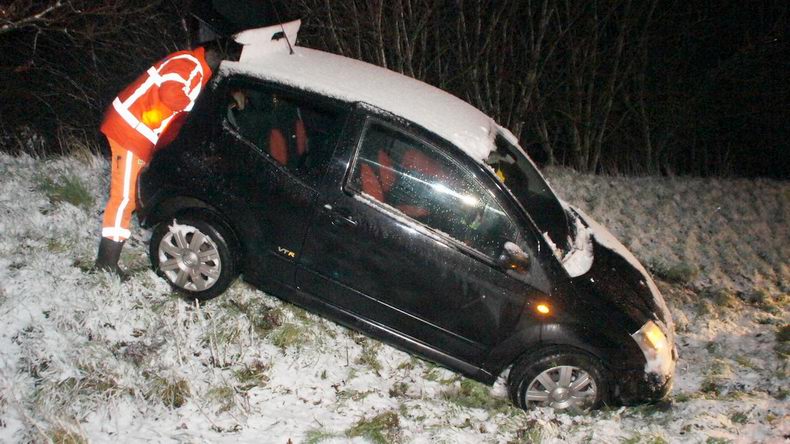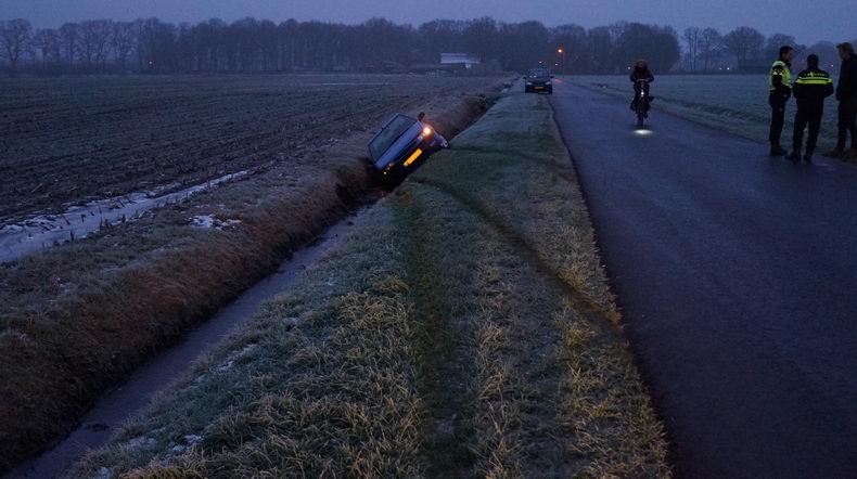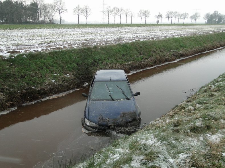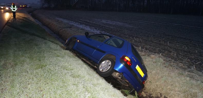 | Hoewel er in de afgelopen nacht vanwege de vorst en de mist intensief zout gestrooid werd en het ogenschijnlijk nergens meer glad was, bleek dat de afgelegen Prugelweg in Brucht kennelijk rond half acht nog niet aan de beurt was geweest. De twee inzittenden van en Citroën Saxo kwamen daar na een flauwe bocht tot hun schrik achter: de auto raakte onbestuurbaar en kwam achterstevoren in een ondiep bermslootje tot stilstand. De meldkamer stuurde brandweerteams uit Hardenberg en Bergentheim, poltie en ambulance op pad, maar het bleek allemaal mee te vallen. Berger Wolves haalde de verfomfaaide Saxo op. |