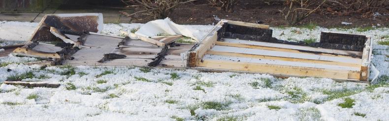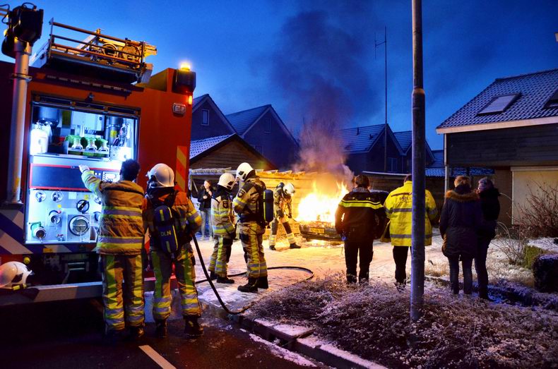 | Dinsdagmiddag tegen half vijf spoedde de Hoogeveense brandweer zich naar het Zuideropgaande in Hollandscheveld, waar een brand in een keet of een schuurtje zou woeden. Maar al snel werd duidelijk, dat de brand al was overgeslagen naar een loods achter een pas afgebouwde woning en dat het dak van die loods inmiddels al in brand stond. De vlammen verspreidden zich razend snel door het gebouw en zo nu en dan klonk er een ontploffing, waarschijnlijk van een gasfles. Er moesten extra watertankwagens worden opgeroepen worden uit nabijgelegen kazernes om de aanvoer van bluswater te garanderen. Dikke zwarte rookwolken dreven over het dorp en het regende roetdeeltjes, zoals velen bij thuiskomst o.a. op hun kleding ontdekt zullen hebben. De loods ging volledig verloren, maar de woning kon behouden worden. Zie de uitgebreide fotoreportage voor de resterende beelden! |