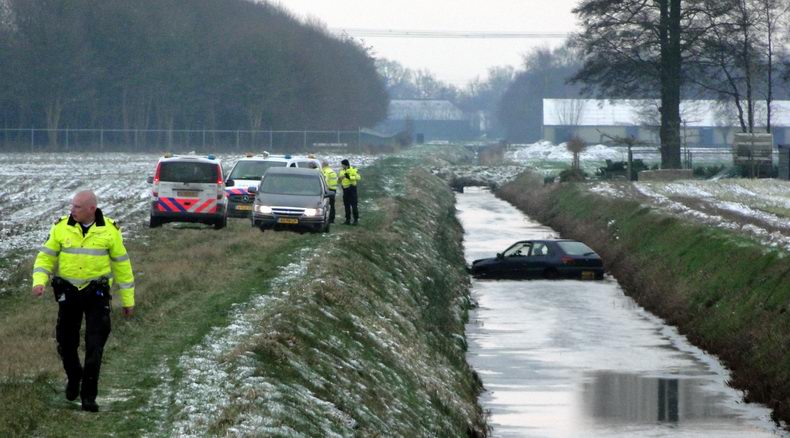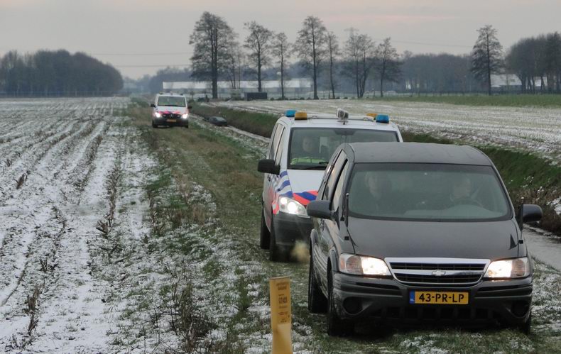 | Dinsdagmiddag werd een VOA-onderzoek ingesteld op en naast een akker aan de Tweede Valthermond. Aanleiding was de vondst van het stoffelijk overschot van een man in een blauwe Peugeot 307 in een sloot tussen twee stukken bouwland. Uit de sporen viel op te maken, dat de auto van de Tweede Valthermond naar links af was gebogen en enkele meters over het bouwland was gereden, waarna de wagen de sloot in was gedoken. De bestuurder -een 43-jarige inwoner van Borger-Odoorn- is waarschijnlijk kort voor de stuurloze rit buiten westen geraakt. Het stoffelijk overschot werd met een lijkwagen opgehaald. |