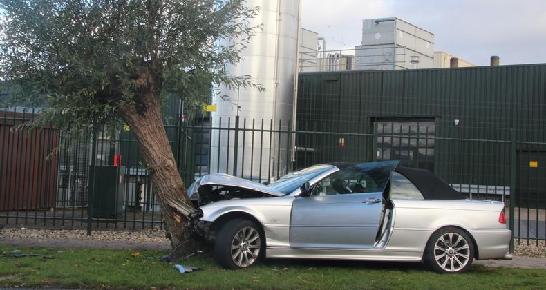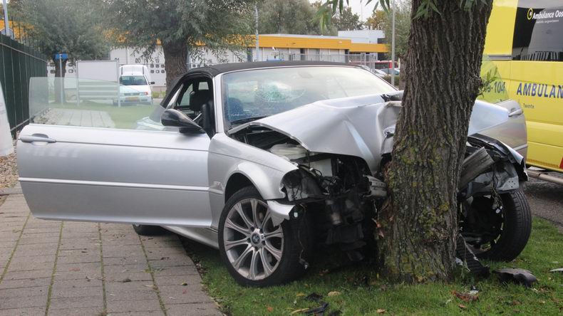 Zondagmorgen is op de Breukersweg in Goor een BMW cabrio in een bocht geslipt en frontaal tegen een boom gebotst. |