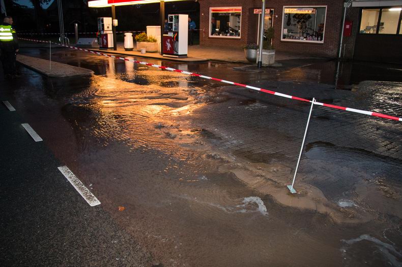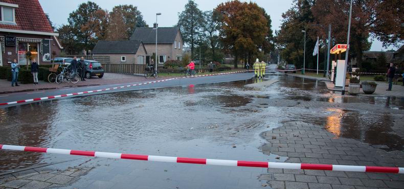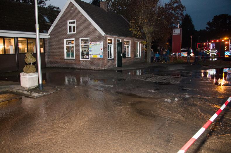 | De brandweer van Lemelerveld is vrijdag 4 november rond 17:00 uur in actie gekomen na een melding over wateroverlast aan de Hellendoornseweg in Lemele. Er bleek een transportleiding te zijn gesprongen. Op het terrein van het Hartholt Olie tankstation kwam het water op meerdere plekken omhoog met als gevolg dat de straat volledig blank kwam te staan. De brandweer heeft de leiding aan het begin van de Hellendoornseweg afgesloten waardoor de riolering de grote hoeveelheid water weer aankon en met een beetje hulp van de brandweer was de straat al snel weer "droog". Monteurs van waterbedrijf Vitens hebben herstelwerkzaamheden uitgevoerd en rond 21:00 uur kon de druk weer worden opgebouwd. Het was de voorlichter van het waterbedrijf niet bekend hoeveel aansluitingen zonder water hebben gezeten. Tijdens de lekkage is de Hellendoornseweg voor al het verkeer afgesloten geweest. |