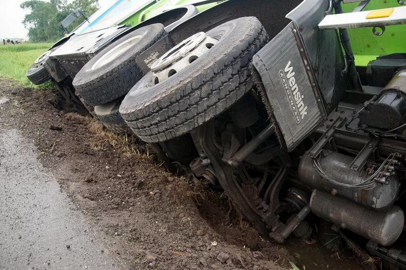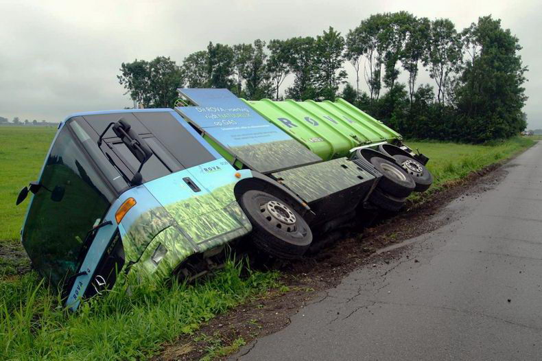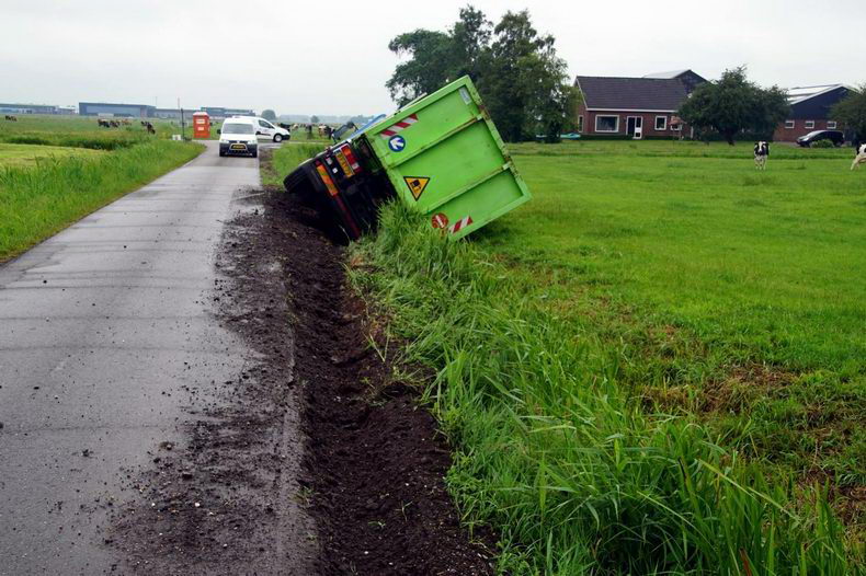 | Aan de Polleboersweg is woensdagmorgen een vuilniswagen gekanteld en in een sloot beland. Toen de vrachtwagen naast de weg kwam, probeerde de bestuurder bij te sturen, maar door een meesturende achteras raakte het voertuig compleet naast de weg en begon te kantelen. Enkele weken geleden zijn in de berm leidingen gelegd voor de nutsvoorzieningen van de woningen aldaar. Mede daardoor was de berm nog erg zacht en had de chauffeur, die bij het ongeval niet gewond raakte, geen kans. |
