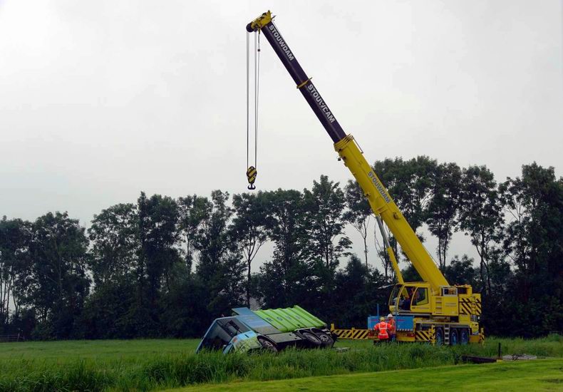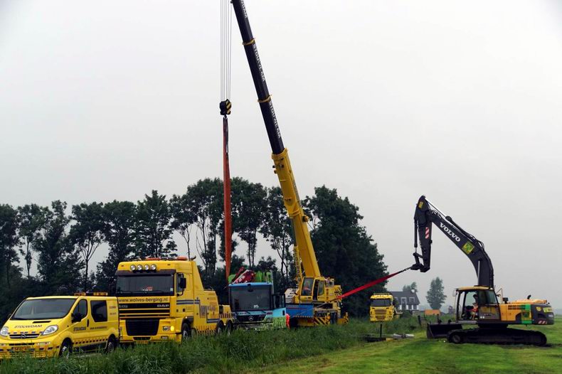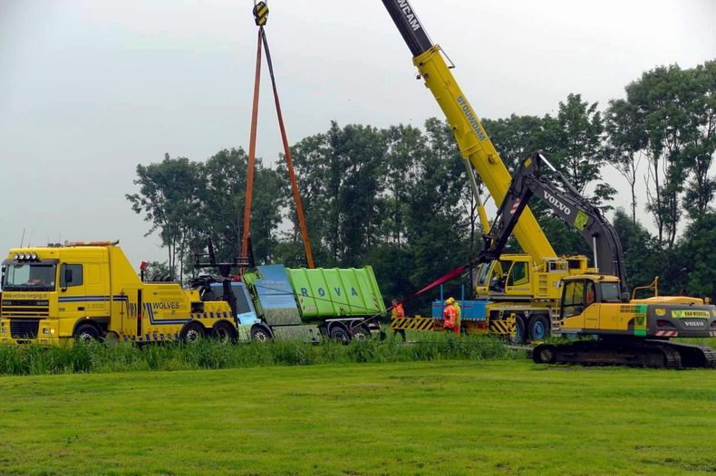 | De vuilniswagen, die woensdagmorgen aan de Polleboersweg van de weg raakte en in een sloot terecht kwam, is woensdagavond succesvol geborgen. Tussen de flinke regenbuien door waren de mannen van bergingsbedrijf Wolves, kraanbedrijf Stouwdam en machinisten en chauffeurs van Van Werven druk in de weer. Tegen 20:00 uur stond de vuilniswagen zonder extra schade weer op zijn wielen op het smalle weggetje. De operatie begon rond 16:30 uur nadat de telekraan en het zware bergingsvoertuig op hun plaats waren gezet. Het werken op de smalle weggetje maakte het allemaal niet makkelijk. Tijdens het hijsen werd duidelijk dat het gemaakte plan van aanpak niet direct zou werken: er moest, naast de opgestelde voertuigen, ook vanuit een andere hoek getakeld worden. Een rupskraan werd gepositioneerd in het naastgelegen weiland. Met de giek kon er nu ook zijdelings kracht worden gezet en kwam de vrachtwagen al snel in de juiste richting. Na enkele uren takelen stond de vuilniswagen uiteindelijk weer op zijn wielen op de Polleboersweg. De vrachtwagen werd op de lepels genomen van het bergingsvoertuig en werd afgevoerd. Ondertussen werden de rijplaten en draglineschotten weer opgeladen en maakte de machinist van de rupskraan het weiland weer vlak. Rond 21:30 uur vertrok het laatste voertuig. Donderdag zal de Rova de schade opnemen aan de weg en de slootwal en deze eventueel repareren. |