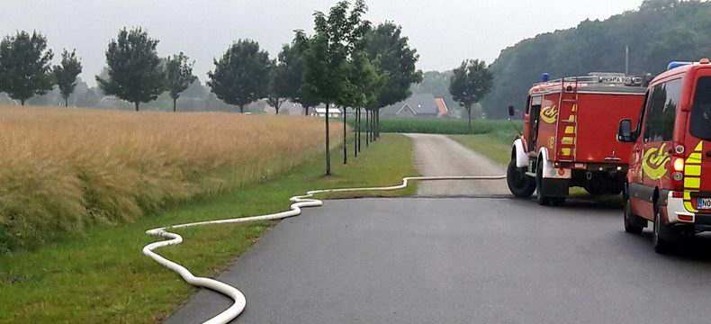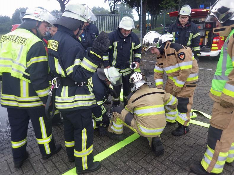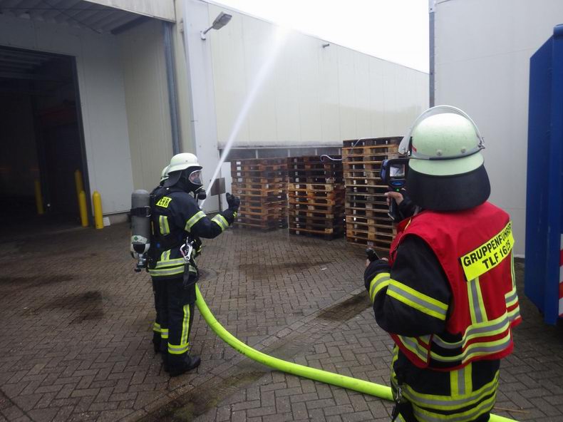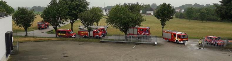 | Woensdagavond vond er een gemeenschappelijke oefening plaats, waar de brandweer Wilsum (D) en blusgroepen uit Hardenberg en Bergentheim (NL) aan deelnamen met in totaal zo’n zestig man en negen voertuigen. De oefening vond plaats bij de firma WKS op het bedrijventerrein in Wilsum. Voor bluswater moest een 500 meter lange aanvoer worden aangelegd Volgens het scenario woedde er brand in buiten opgeslagen pallets en was het vuur reeds overgeslagen op de fabriekshal, waardoor 30.000 liter stookolie in brand dreigde te vliegen. Er werden meerdere personen vermist en daarom werd in eerste instantie de nadruk gelegd op hun redding. |