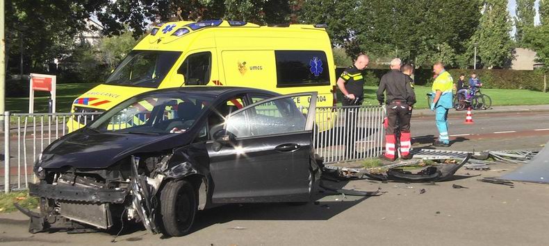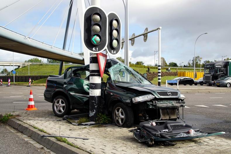 | Op de kruising van de Hasselterweg met de Westenholteallee is donderdagmiddag een auto tegen een verkeerslicht gebotst. De auto kwam om de mast tot stilstand na een kleine botsing met een bestelbus. Ondanks de flinke schade raakte niemand gewond. De bestuurder van de auto kon, nadat de brandweer de deur had weggeknipt met hydraulisch redgereedschap, zelf uit de auto stappen. Hij werd in een ambulance onderzocht op letsel. Op een zere vinger na mankeerde de man wonderbaarlijk genoeg niets. De bestuurder van de bestelbus hield ook niets over van het ongeval. Hij kon zijn weg vervolgen na het afgeven van een verklaring en het uitwisselen van de nodige gegevens. Bergingsbedrijf Wolves heeft de compleet verwoeste auto afgevoerd. Het ongeval leidde tot een flinke vertraging. Enkele rijbanen werden afgesloten voor het werk van de hulpdiensten. Door de botsing raakte het verkeerslicht beschadigd. De schade zal zo snel mogelijk gerepareerd worden. |