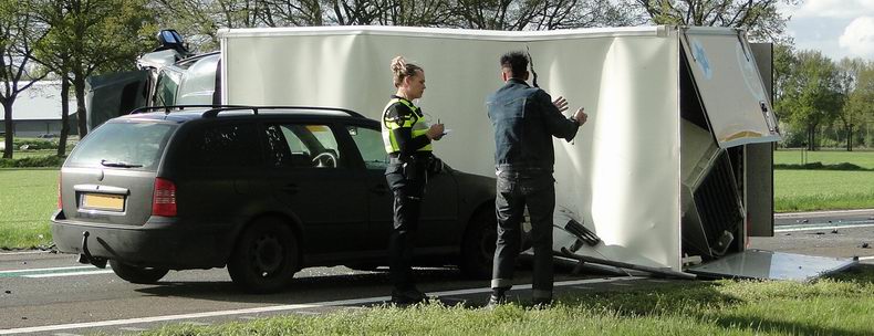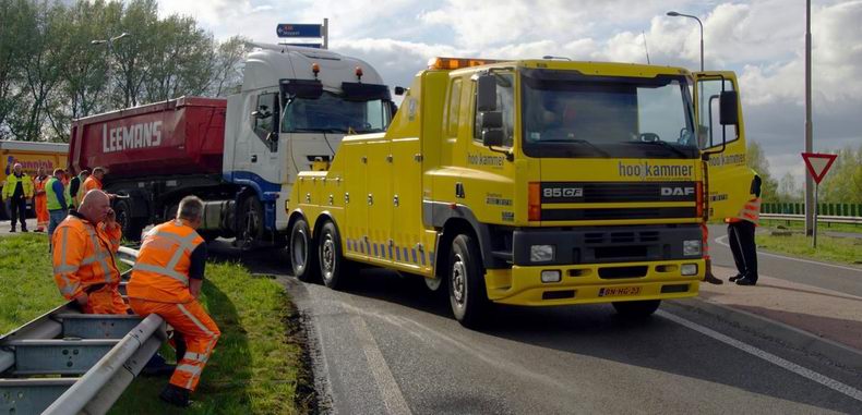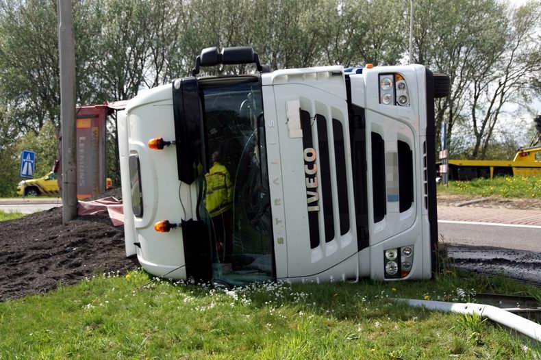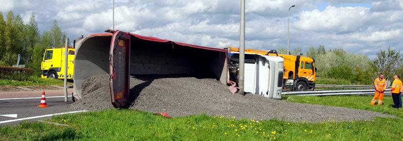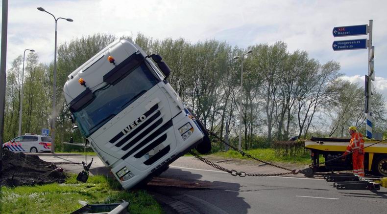 | Op een rotonde van de N375 is maandagmiddag een vrachtwagencombinatie gekanteld. Vanwege het ongeval werd de afrit Meppel-Noord van de A32 afgesloten voor het verkeer. Ook het verkeer op de N375 kon vanuit Meppel niet rechtdoor richting Ruinen en moest de oprit van de A32 nemen richting Zwolle. Volgens een getuige viel de combinatie plots om tijdens het nemen van de rotonde. De vrachtwagenchauffeur kwam met de schrik vrij. Voordat de met gefreesd asfalt geladen vrachtwagen weer overeind werd getakeld moest eerst de inhoud overgeladen worden. Met een graafmachine van de firma Dunnink werd de lading in een bakwagen van Engel geladen. Ondertussen werd door van der Kolk het wegdek gereinigd van weggelopen diesel. Bergingsbedrijf Hooikammer had ondertussen de gekantelde vrachtwagen aan twee bergingsvoertuigen gekoppeld. In no-time stond alles op de wielen en werd de boel overgebracht naar het depot in Staphorst. Als laatste werd een flink gedeelte van de berm gesaneerd. De rotonde en de afrit werden tegen 18:30 uur vrijgegeven |