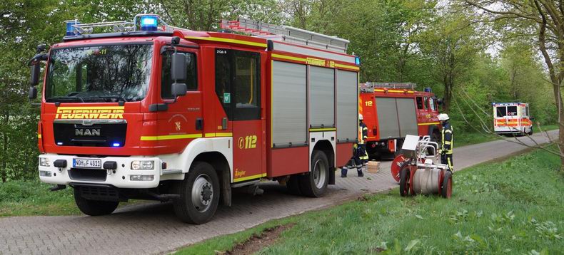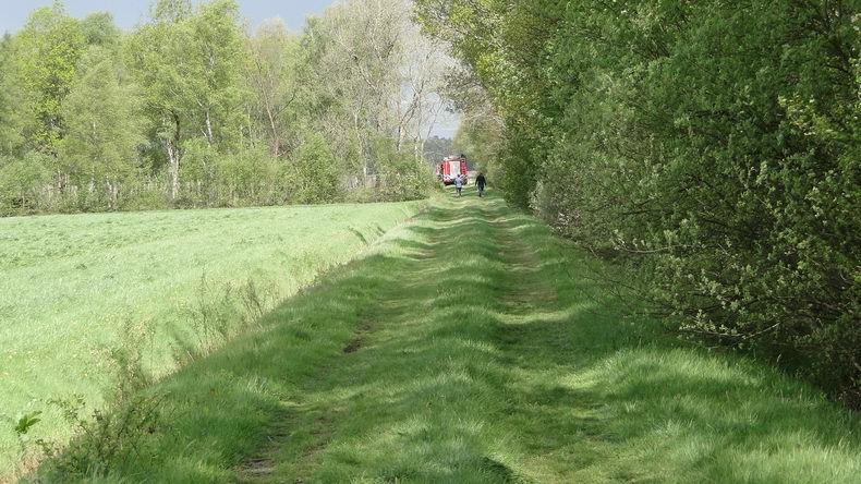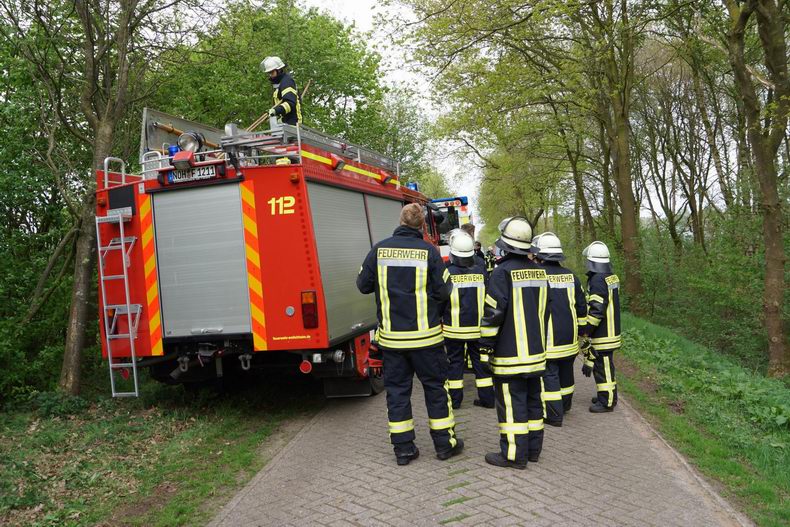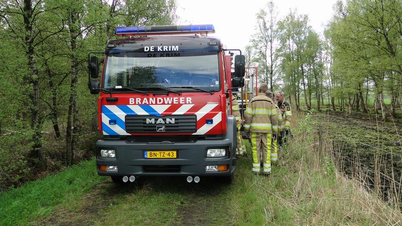 | Bij toeval ontdekte een wandelaarster donderdag in het begin van de middag in een afgerasterd gedeelte aan het onverharde pad naar het natuurterrein van Het Drentse Landschap, dat één van de koeien met een achterpoot bekneld lag onder een boom. De vrouw belde de dierenpolitie, waar men de melding doorgaf aan de brandweer en de blusgroep De Krim -letterlijk- op pad gestuurd werd. De plek waar het dier in nood verkeerde lag op enkele honderden meters van de Steigerwijk. Na aankomst werd de koe vakkundig uit haar benarde positie bevrijd. Het dier bleek ongedeerd en begon direkt rustig van het aangesleepte hooi te eten. Na deze goede daad reed tankautospuit achterwaarts terug naar de Steigerwijk om te terugtocht naar de kazerne te aanvaarden. |