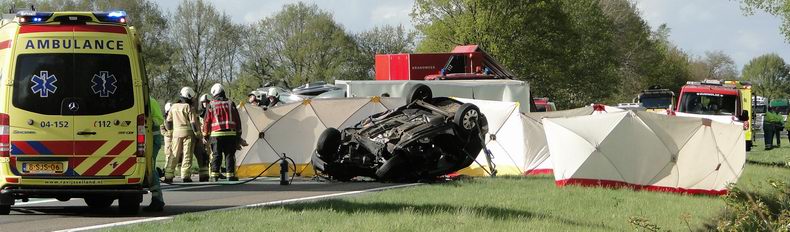 | Bij een frontale botsing tussen een personenauto en een Mercedes Sprinter bakwagen is donderdagmiddag de 59-jarige bestuurster van de personenauto om het leven gekomen. Het ongeval gebeurde rond kwart over vijf, ten zuiden van Zuidwolde, ter hoogte van het composteerterrein. Na de botsing kantelde de vrachtwagen; de personenuto kwam op zijn dak tot stilstand. Beide voertuigen waren total loss. Na de botsing reed een andere personenauto tegen het dak van de huif van de gekantelde vrachtwagen. De bestuurder van de Sprinter is aangehouden, aldus de politie Hij is na verhoor vrijgelaten, maar blijft verdachte. Zijn bijrijder is per ambulance naar een ziekenhuis vervoerd. De N48 was tot ca half tien tussen de N377 en knooppunt Hoogeveen in beide richtingen afgesloten. |