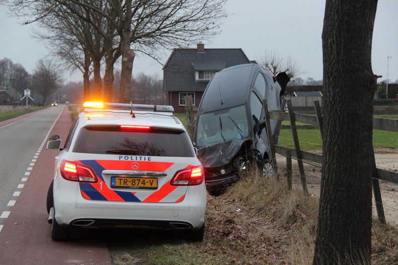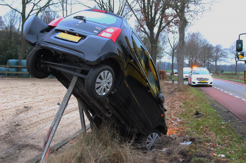 | Zaterdagmiddag verloor de bestuurster van een Suzuki Alto de macht over het stuur, toen rond half drie ze op de Poggebeltsweg in Haarle met twee wielen in de berm belandde. De beruchte ruk aan het stuur had het bekende funeste resultaat: de auto schoot rakelings langs een boom, dook de bermsloot in en kwam met fikse schade op de afrastering van een paardenbak tot stilstand. De vrouw kwam met de schrik vrij. |