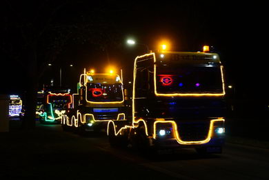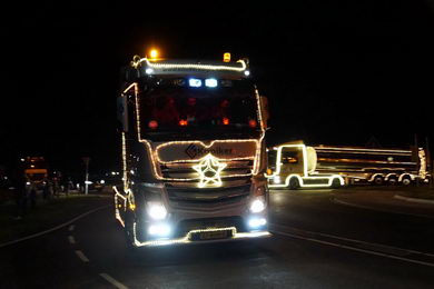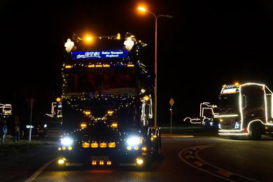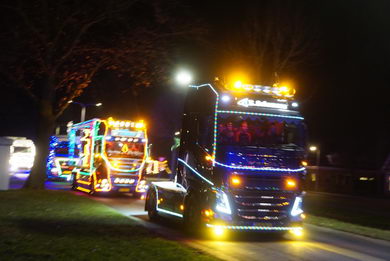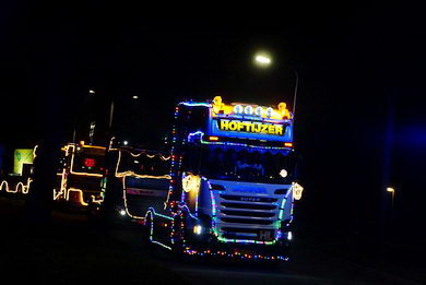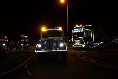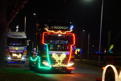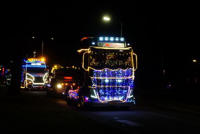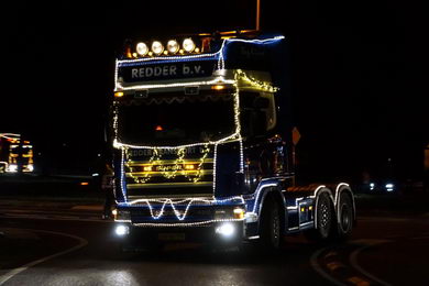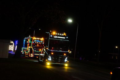 | Ook in Twente vond zaterdagavond een optocht van feeëriek verlichte vrachtwagens plaats. De imposante stoet vertrok van café De Brug in Geerdijk. Deze fotoserie werd gemaakt bij de rotonde Marleseweg - Vriezendijk in Den Ham. |