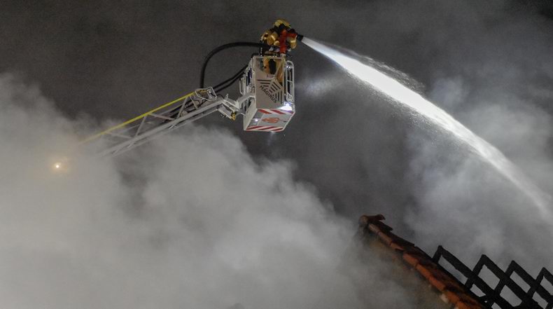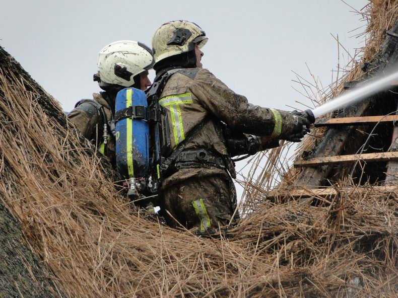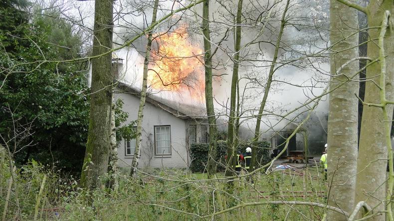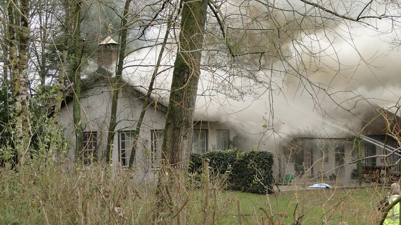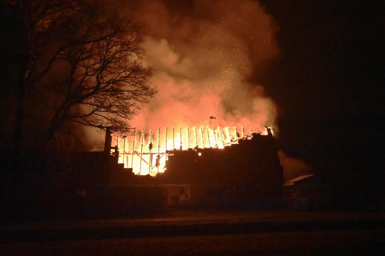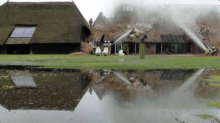 | Donderdagmiddag is brand uitgebroken in de rieten kap van de riante woonboerderij van voormalig Commissaris der Koning Jacques Tichelaar aan de Staphorsterweg in De Schiphorst. De brandweer zette direct groot materieel in, waaronder de 3 km slangenwagen uit Coevorden. Met bovenmenselijke krachtsinspanning en miljoenen liters water slaagden de spuitgasten er in, de brand de baas te worden, hoewel het er een tijdlang op leek dat het pand niet te redden was. Door grote hoeveelheden riet uit het dak te plukken en er met een kettingzaag sleuven uit te zagen lukte het alsnog. Het gazon veranderde daardoor in een ondiepe vijver. De schade aan het achterste deel van het dak is zeer groot. |