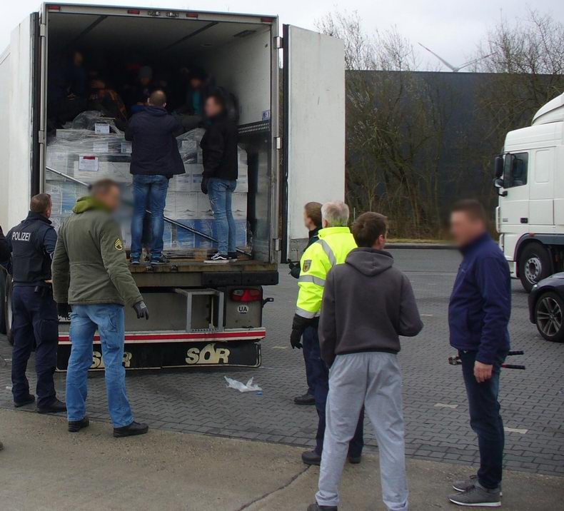 Een Oekraiense vrachtwagenchauffeur hoorde tijdens een rustpauze op parkeerplaats "Bentheimer Wald" aan de Autobahn 30 klopsignalen uit de laadruimte van zijn oplegger en belde de politie. De agenten openden de verzegelde ruimte en ontdekten negen Irakezen, waaronder twee vrouwen en twee kinderen (10 en 12 jaar). |