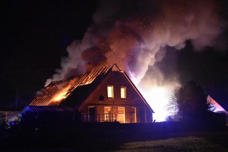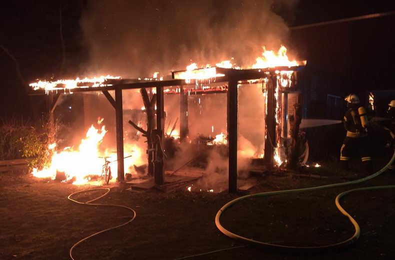 | In de nacht van zaterdag op zondag brandde de uitbouw van een vrijstaande woning aan de Grüner Weg in Neuenhaus af. De brandweer kreeg de melding om 01:25 uur. De bewoners, waaronder drie kinderen, konden zich bijtijds in veiligheid brengen De brandweer van Neuenhaus en van Lage rukte met 35 man en zes voertuigen uit. Het vuur werd door middel van binnen- en buitenaanvallen bestreden. De uitbouw was helaas niet meer te redden, maar overslag op de rest van het pand kon worden voorkomen. De politie deed aansluitend onderzoek naar de oorzaak van de brand. De politie legde daartoe beslag op de woning. Foto's: Feuerwehr Neuenhaus |