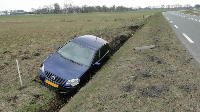 | Zondagmiddag is een Volkswagen Polo, die over de Boerdijk uit de richting van Veenoord kwam, na de flauwe bocht vlak voor de kruising met de Deutlanden van de rijbaan geraakt en in het bermslootje tot stilstand gekomen. De auto liep relatief lichte schade op. De bestuurder is zonder spoed per ambulance naar een ziekenhuis overgebracht. |
