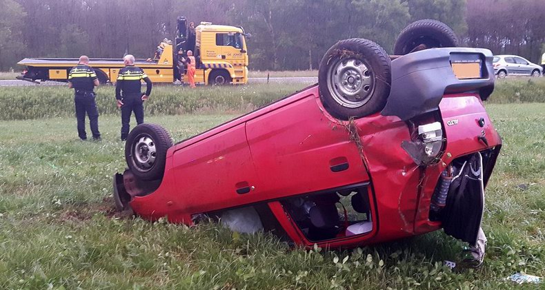Dinsdagavond is een personenauto op de A28, tussen Hoogeveen en Pesse, van de weg geraakt en via de bermsloot in een weiland over de kop geslagen. De auto -een 15 jaar oude Suzuki Alto- bleef op zijn dak liggen. |