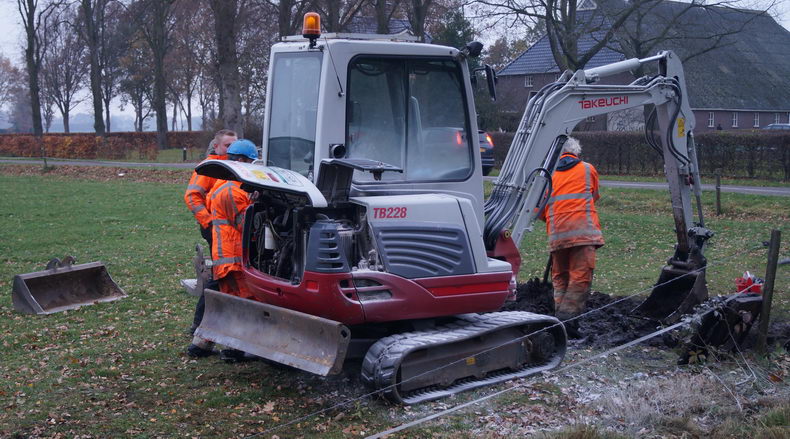 Tegen half vier donderdagmiddag werd de blusgroep Slagharen verzocht met spoed naar de Witmanweg te rijden, omdat er ergens op die weg een "land/bouwvoertuig" in brand stond. En uiteraard bleek het bewuste Takeuchi TB228 rupsgraafkraantje helemaal aan het eind van die lange weg te staan, bijna op de kruising met de Luttergreppel. |