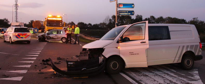 | Dinsdagmorgen rond kwart over zeven liepen een bestelbus en een personenauto forse schade op op de kruising van de op- en afrit van de A1 met de N332. De bestuurder van de bestelbus reed vanaf deA1 de kruising op, maar verleende geen vrije doorgang aan de personenauto, die in de richting van Laren (Gld) reed. Gelukkig bleef het bij materiële schade. |