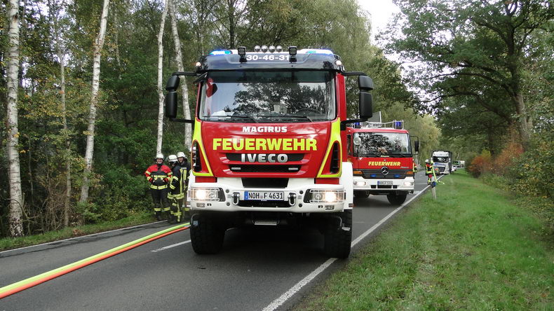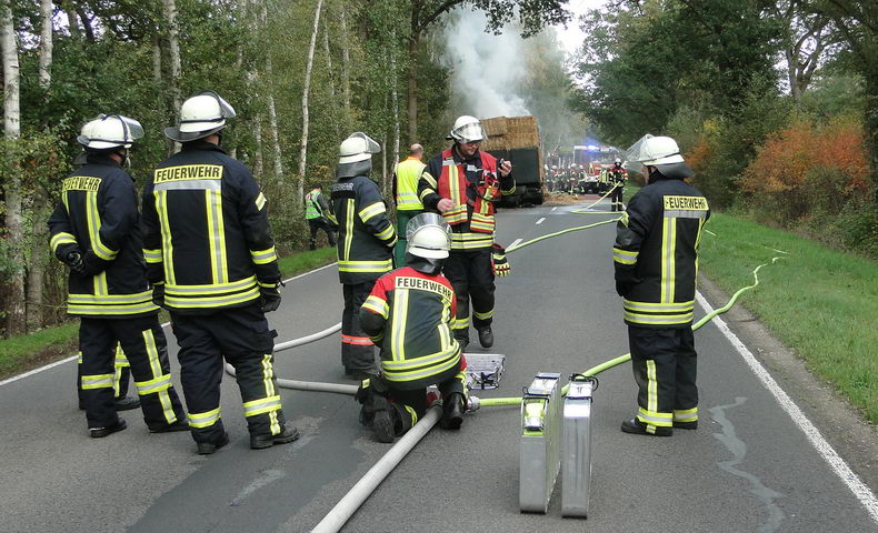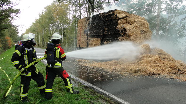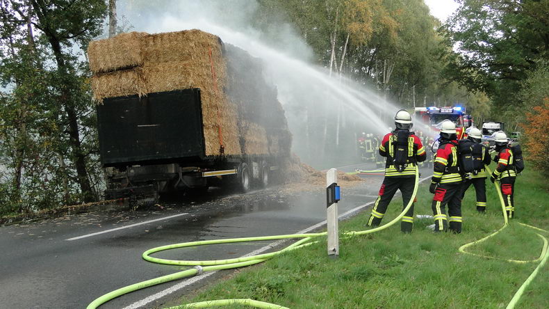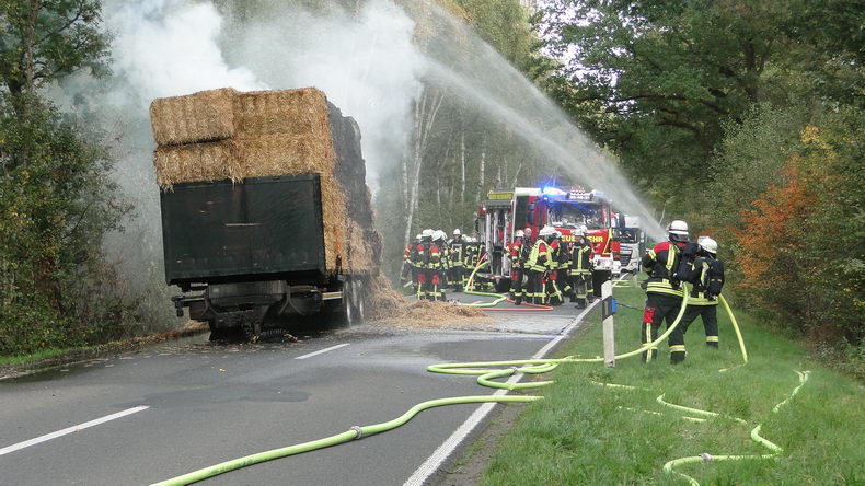 | De brandweer van Emlichheim, Hoogstede en van Ringe-Neugnadenfeld werd dinsdagmiddag opgeroepen vanwege brand in een lading stro. De brand woedde op de Kanalstraße tussen Ringe en Emlichheim in de lading van de aanhangwagen van een vrachtwagen van een bedrijf uit Ootmarsum. De chauffeur had de aanhanger tijdig afgekoppeld en een eindje weggereden, zodat de Scania en de daarop liggende lading geen gevaar meer liepen. De brandweer zette 58 man en vier voertuigen in. Het vuur bleek moeilijk te bestrijden: de brandhaard bevond zich onder in de lading en de vlammen laaiden direct weer op, zodra de stralen bluswater ophielden. Uiteindelijk werd de lading van de aanhanger gelost met een verreiker en kon het vuur gdoofd worden, nadat het stro op de weg gedeponeerd was. De weg was vier uur lang afgesloten. |