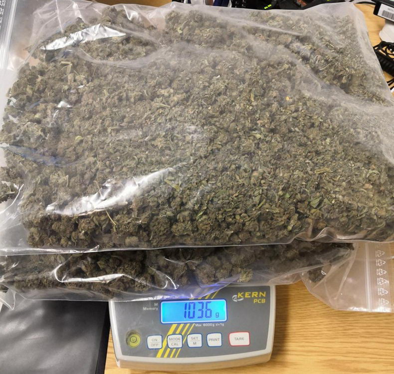 | Op woensdag 22 april controleerden ambtenaren van de Bundespolizei op de B 54 in Gronau een dertigjarige Duitse vrouw en een 32-jarige Duitser die even daarvoor in een Opel Astra vanuit Nederland de grens gepasseerd waren. In de kofferbak vonden ze een boodschappentas waarin een plastic zak met 1036 gram marihuana bleek te zitten. Verder werden in de kleding van het stel vier gram amfetamine en vier gram marihuana aangetroffen. Ze zijn in voorlopige hechtenis genomen. De straatwaarde van de in beslag genomen drugs beloopt ongeveer € 10.500. Foto: Polizei |