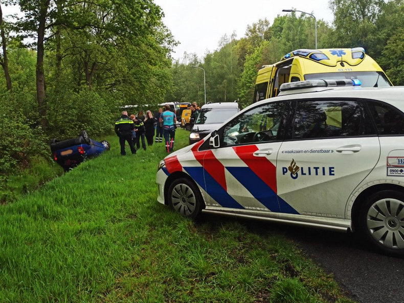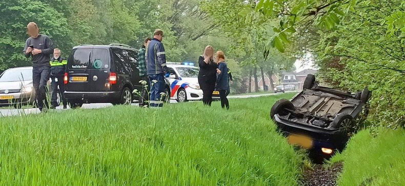 Op de Antares in Klazienaveen is woensdagmorgen een auto van de weg geraakt en op de kop in de droge bermsloot beland. |