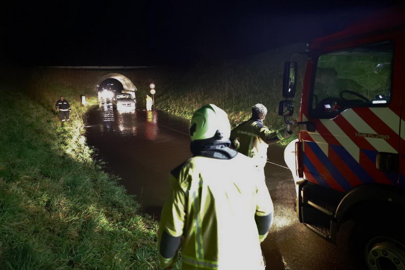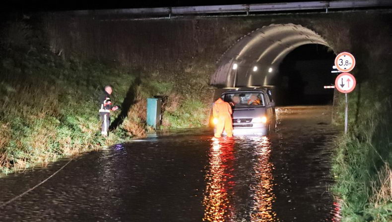 Maandagavond is een VW Transporterbusje blijven steken doordat de motor afsloeg in de door de hevige regenval ondergelopen tunnelbak van de Heiakkers onder de N34 van Gieten naar Zuidlaren. |