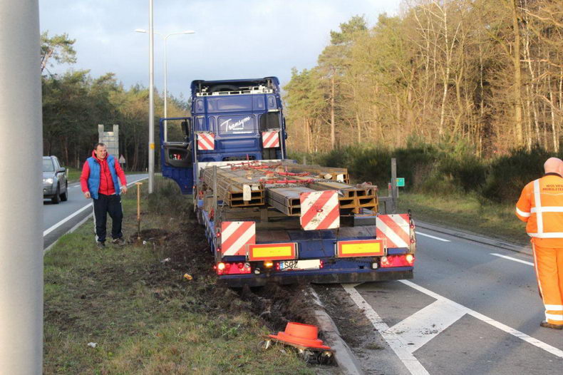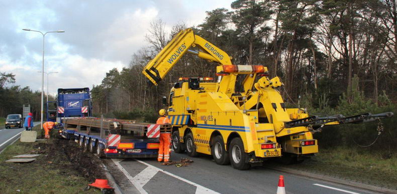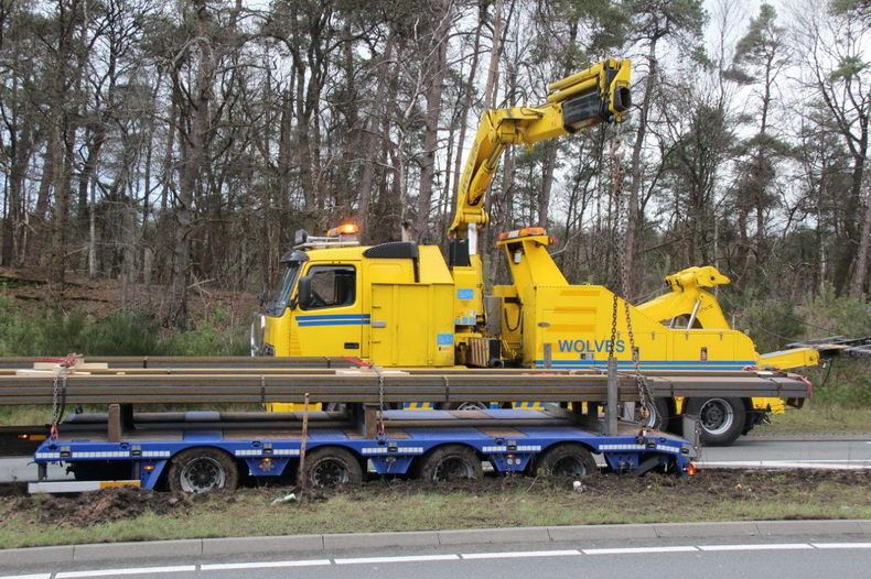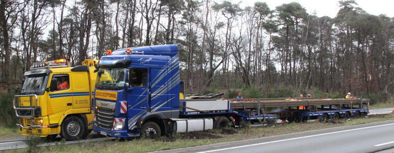 | Dinsdagmorgen is een Poolse trekker met een met stalen balken geladen dieplader vast komen te zitten in de middenberm van de N35 tussen Nijverdal en Haarle. Het kostte de nodige moeite de combinatie, die steeds verder weg zakte, vrij te krijgen, maar uiteindelijk lukte het de oplegger uit de modder te tillen. Het verkeer in en rond Nijverdal liep muurvast. |